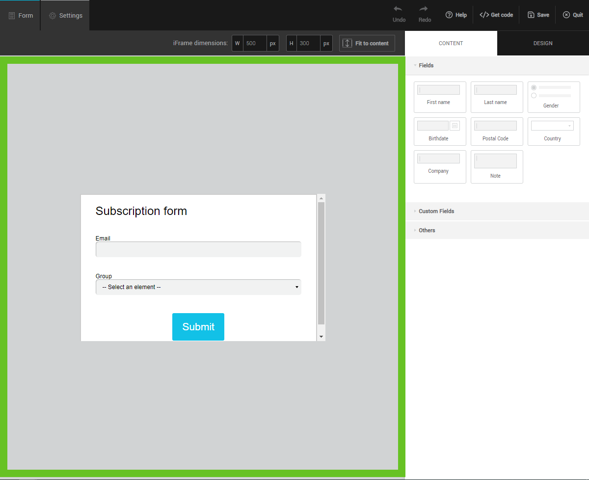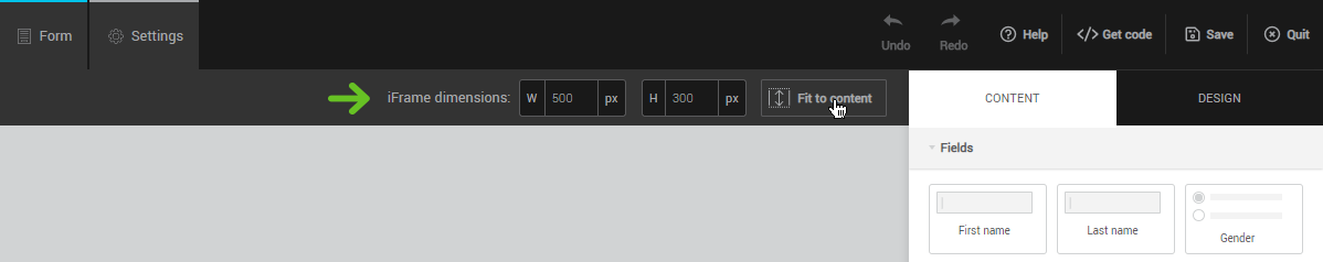 If you are creating an iframe form, the top bar will allow you to adjust its dimensions. Enter the desired width and height for the preview to update. If you wish, use the Fit to content button to allow the height to adjust automatically based on the content of the form.