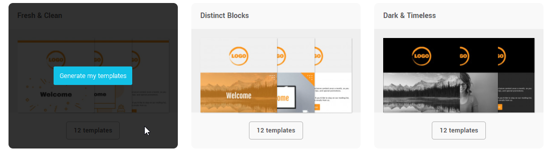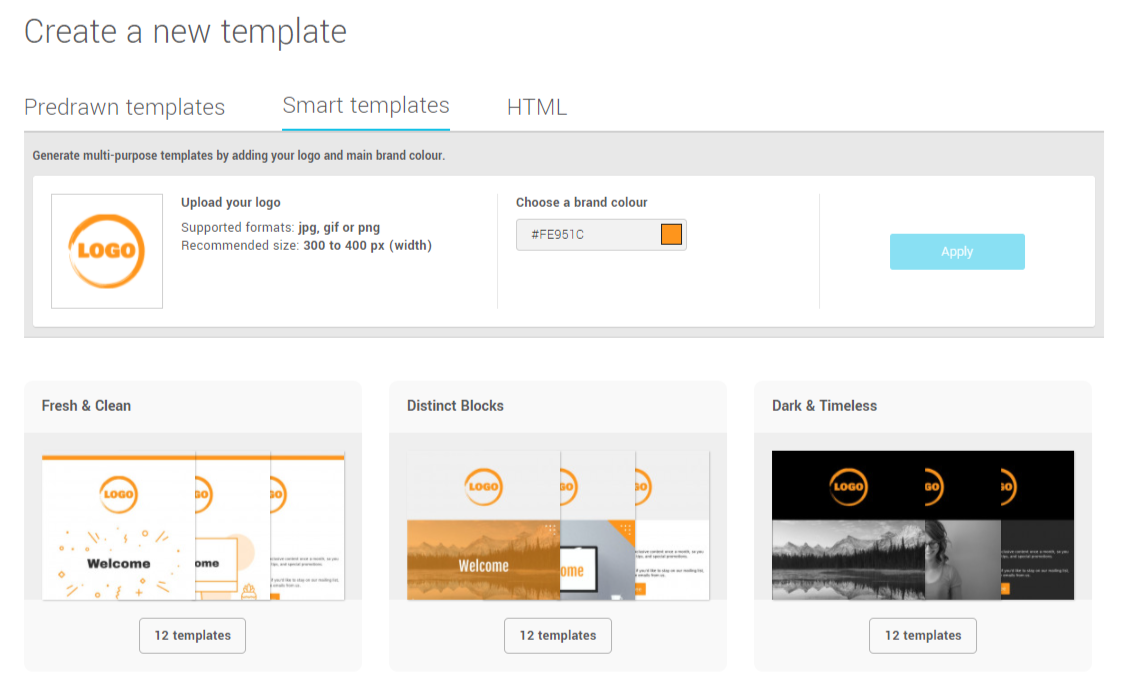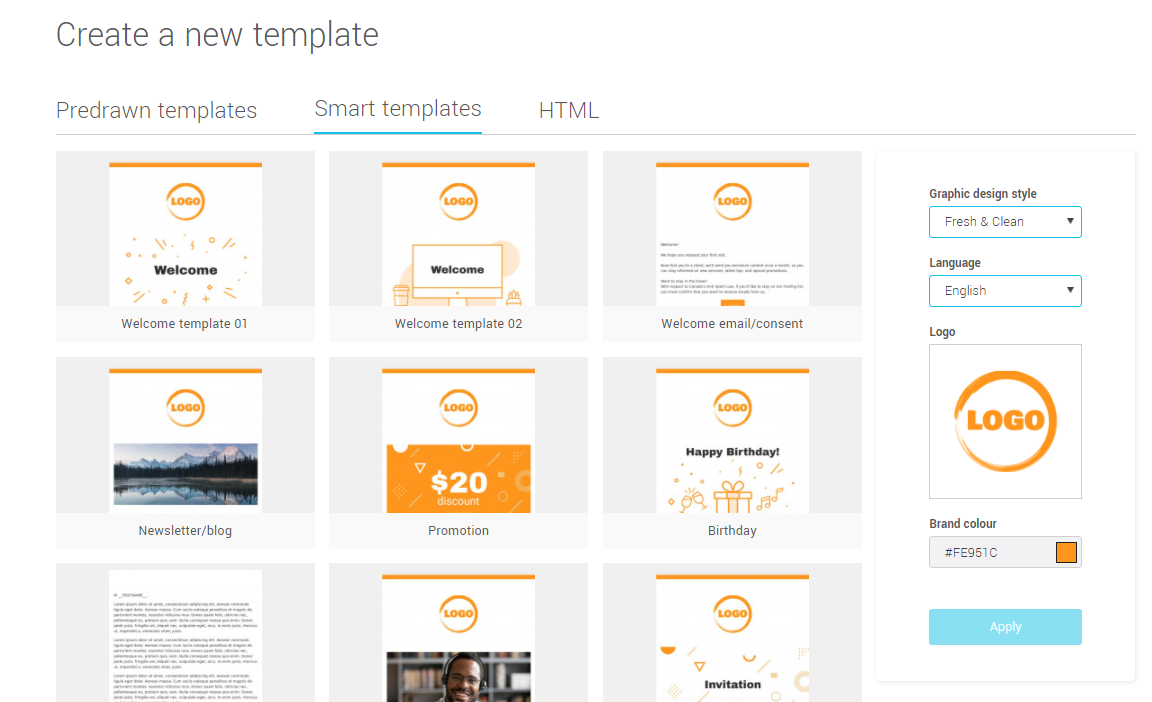Smart templates allow you to generate, with just a few clicks, a series of ready-to-use templates that reflect your brand. Simply upload your logo and brand colour, pick a graphic design style and you'll be ready to go. The templates generated should cover all of your basic emailing needs: Welcome emails, birthdays, newsletter, promotions and more.