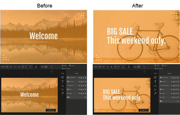When you choose a template, all of its images are automatically added to a sub-folder in your image directory called smart_images. This folder is accessible from all your templates. You can reuse your images as is or modify them using our image editor. Since most of them are editable images, it is very easy to change one or two elements. This will give you a brand new and stylish image in no time, as in the example below. Looking for inspiration or resources? Check out our royalty-free image library