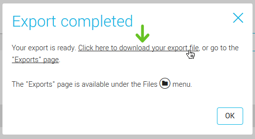 6. Once the export completed, a dialog box will appear on your screen. Click the link to immediately download your export file. The file will be available in your browser's downloads and you'll be able to choose if you want to open it immediately or download the file to your computer.
