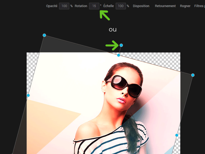 Pour effectuer une rotation de votre image, sélectionnez-la, puis bougez la poignée de rotation au haut de l’image pour la faire pivoter dans un sens ou dans l’autre. Il est également possible d’entrer le nombre de degrés exact dans le champ “Rotation”.