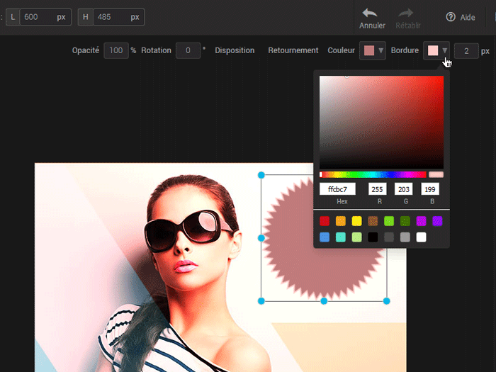 Pour modifier la couleur d’une forme et/ou de sa bordure, cliquez dessus dans la zone image ou cliquez sur son calque pour la sélectionner. Ensuite, cliquez sur le triangle à la droite du carré de couleur. Pour sélectionner une couleur, vous pouvez soit :