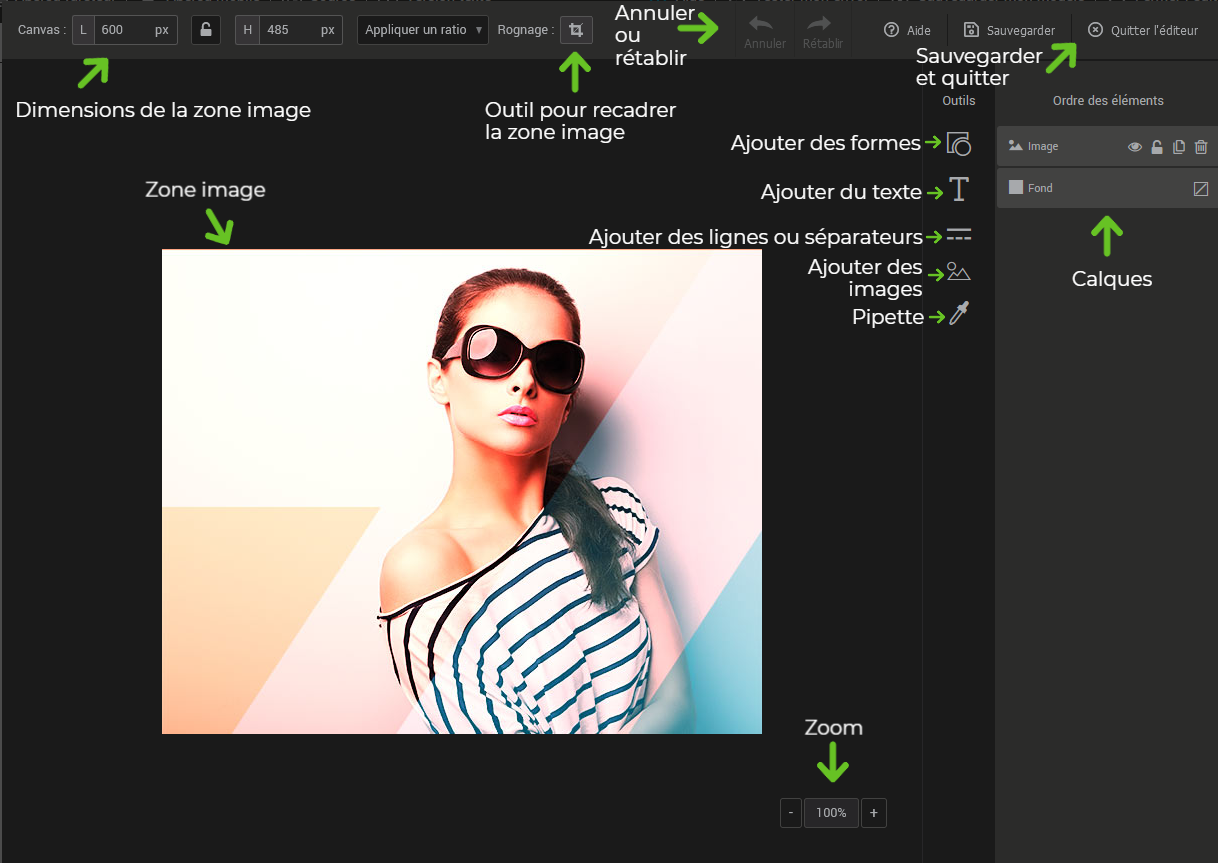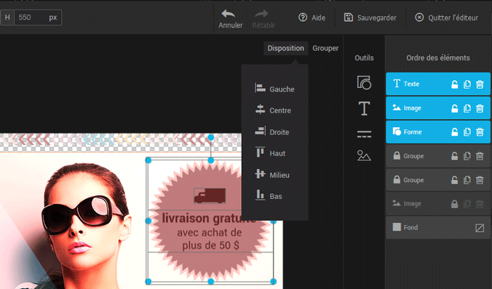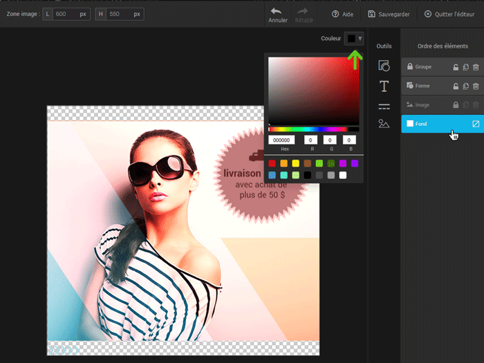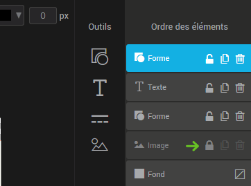 Chaque ajout d’élément via les outils disponibles crée un calque qui apparaîtra complètement à la droite de l’éditeur d’images sous “Ordre des éléments”. Glissez les calques pour modifier l’ordre de présentation des éléments. Le calque de fond est le seul élément que vous ne pouvez pas supprimer. Ce calque définit l'arrière-plan de votre image. Il peut être transparent ou rempli par une couleur.