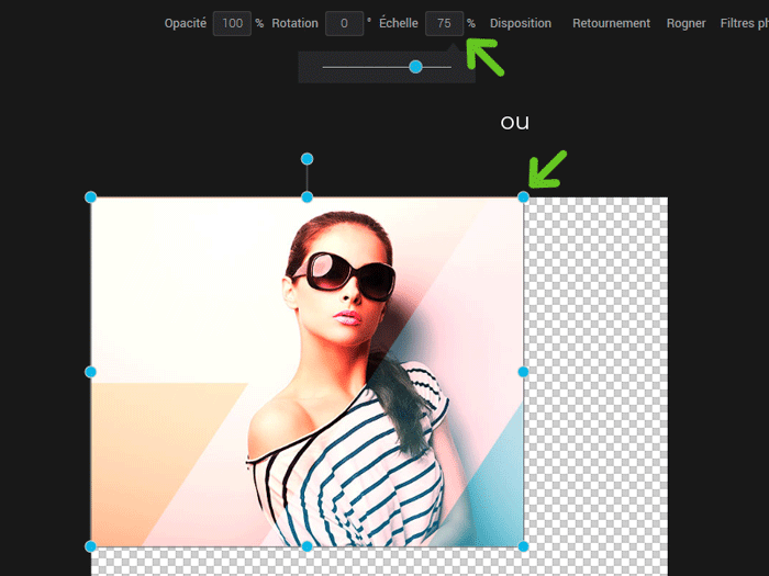 Pour redimensionner proportionnellement à sa taille originale une image, sélectionnez votre image et entrez un pourcentage dans la zone “Échelle” ou déplacez le curseur. Vous pouvez également cliquer sur votre image et déplacer l’un des 4 coins colorés pour l’agrandir ou la rapetisser proportionnellement.
