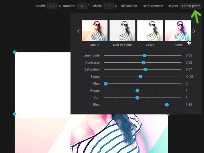 Dans la partie du haut, vous pouvez voir les aperçus des différents filtres prédéfinis. Utilisez les flèches pour les faire dérouler et cliquez sur un filtre pour l’appliquer à votre image. Les filtres prédéfinis ne sont pas cumulatifs : seul le dernier choisi sera appliqué.
