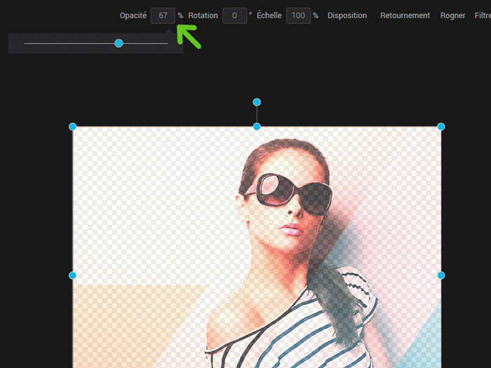 Pour modifier l’opacité, cliquez d’abord sur votre image pour la sélectionner (ou sur son calque). Cliquez ensuite dans la zone de % d’opacité pour entrer manuellement un pourcentage ou déplacez le curseur.