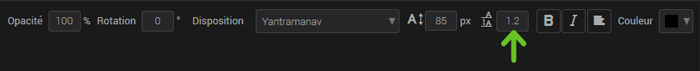 Entrez une valeur entière (1, 2, ...) ou décimale (1.5) dans le champ prévu à cet effet pour contrôler l’espacement des lignes. Notez que cela ne sera visible que sur un texte sur plusieurs lignes!
