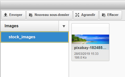 Vous souhaitez réutiliser une image que vous aviez trouvée dans la banque d'images Pixabay et l'ajouter l'image dans un autre bloc d'image ou comme image de fond dans l'arrière-plan de votre courriel ? Pas de panique ! Toutes les images précédemment sélectionnées dans la banque d'images Pixabay peuvent être retrouvées dans le sous-dossier nommé "stock_images" de votre dossier d'images.