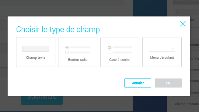 Une fenêtre s’ouvrira pour vous laisser choisir le type. Les types disponibles sont : champ texte, boutons radio, cases à cocher et liste déroulante. Il sera toujours possible de modifier le type plus tard.