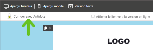 Pour lancer le correcteur, cliquez simplement sur l'outil Corriger avec Antidote qui est situé en haut à gauche de l'éditeur.