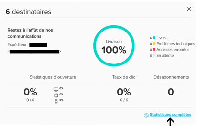 Pour accéder aux statistiques complètes de l'envoi, cliquez sur le lien Statistiques complètesau bas à droite de l'encadré. La page des statistiques s'ouvrira alors dans un nouvel onglet de votre navigateur.