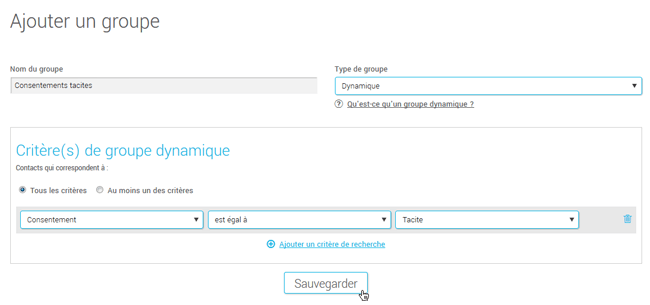 Comme le consentement d'un contact peut évoluer (par exemple lors de la mise à jour d'un contact, de l'utilisation des liens de confirmation de consentement...), nous vous suggérons d'utiliser les groupes dynamiques, car ils sont mis à jour de façon automatisée.